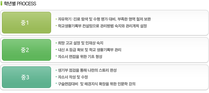 - 입시분석을 통한 입시전략 설정 - 방학 중 부족한 영역 집중강화 2학년 생기부 점검과 본격 입시준비 사전 점검으로 자소서 및 면접을 위한기초 스토리 라인 형성 |